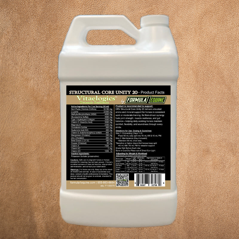 At its core, DRV Structural Core Unity 20 builds upon the foundational integrity of CU15, delivering increased lysine, collagen, and supportive joint compounds to meet the higher metabolic turnover in athletic horses.