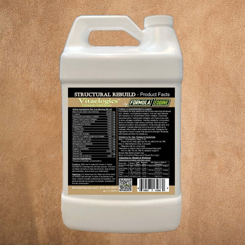Formulated for the high-performance athlete, Structural Rebuild delivers top-tier support for horses performing at their physical peak. Built to reinforce the body’s structural foundation, it provides the advanced nutritional framework needed to offset daily micro-damage, maintain joint elasticity, and promote complete system balance during rigorous training, hauling, and competition.